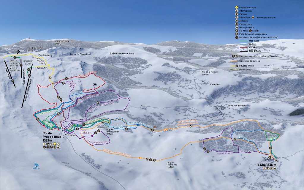 Le domaine nordique s’étend de part et d’autre du Plomb du Cantal avec quatre portes d’entrée : le Col de Prat de Bouc, le Ché, Cézans et Le Lioran.